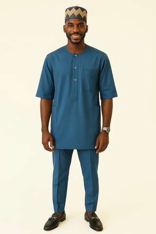 This refined Senator ensemble combines effortless style with cultural sophistication. Designed in a deep navy blue tone, the outfit features a relaxed-fit tunic with short sleeves, front buttons, and a...