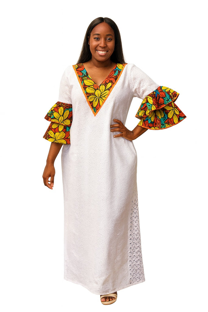 This elegant White Dry Lace Kaftan combines timeless charm with vibrant African artistry. Crafted from premium dry lace fabric, it features a V-shaped neckline and layered bell sleeves beautifully adorned with bright Ankara floral patterns in shades of yellow, red, and teal. The breathable lace texture adds sophistication, while the bold Ankara detailing brings life and color to the design. Perfect for cultural events, elegant gatherings, or festive celebrations, this kaftan offers both comfort and regal flair in every detail.