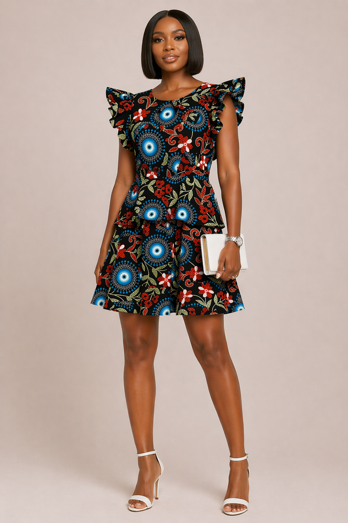 Make a bold statement with this vibrant Ankara mini dress, designed to celebrate color, culture, and femininity. Featuring a striking multicolor floral pattern on a rich black base, this piece is elevated with soft layered ruffle detailing that adds movement and dimension. The back showcases an elegant bow tie detail, creating a flattering silhouette while adding a touch of playful sophistication. Crafted in a structured yet comfortable fit, this dress is perfect for standout occasions, brunch dates, or stylish day-to-night transitions. Pair it with heels and minimal accessories for a polished, high-fashion look.