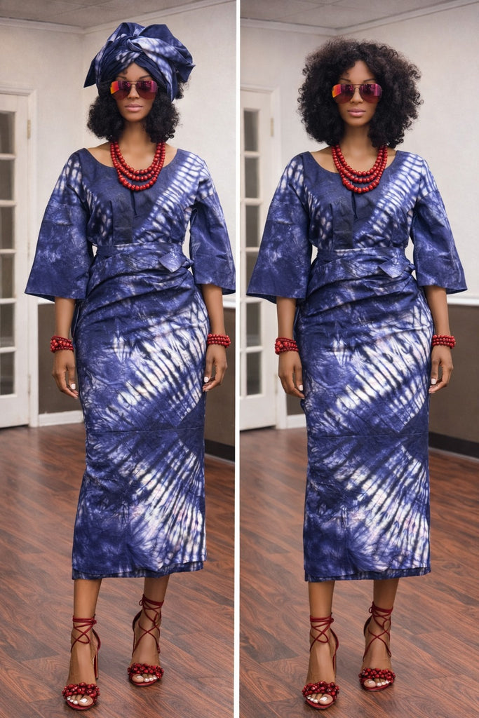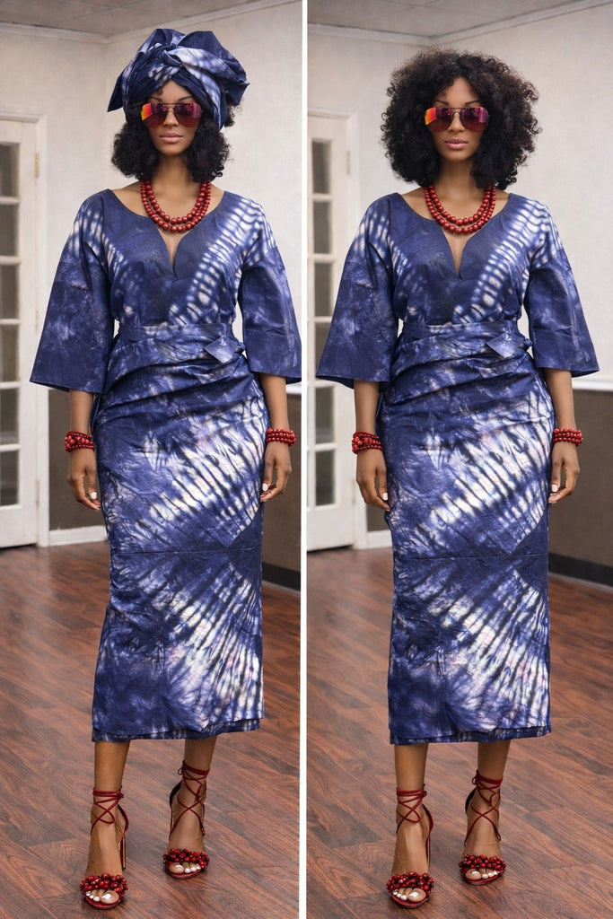 Graceful and culturally refined, this Indigo Tie-and-Dye Top and Wrapper Set is designed to flatter a size 10 frame at 5.8ft height, blending traditional African craftsmanship with modern feminine elegance.