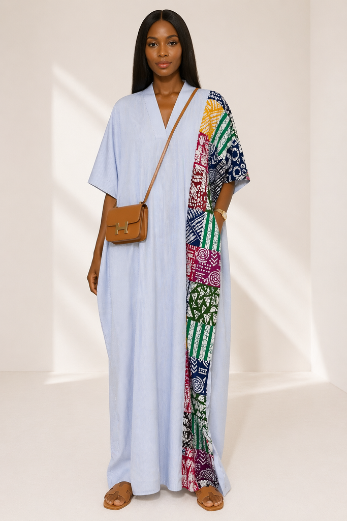 Effortlessly elegant and uniquely bold, this oversized kaftan maxi dress blends soft blue pinstripes with a vibrant multicolor African-inspired patchwork panel. Designed for both comfort and standout style, the relaxed silhouette drapes beautifully, offering a flowy, breathable fit perfect for all-day wear. The modern V-neckline and short loose sleeves create a refined yet easygoing look, while the striking patchwork detail adds a cultural, artistic touch. Ideal for casual luxury or elevated everyday styling, this piece is where simplicity meets statement.