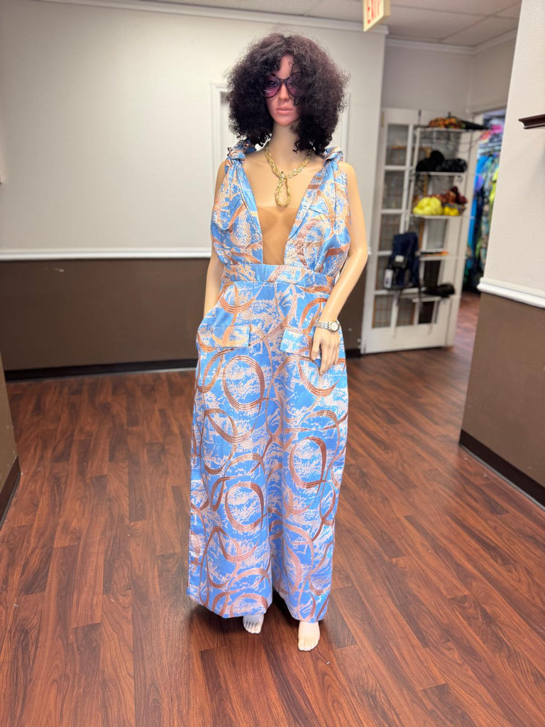 This stunning sleeveless maxi dress is crafted from luxurious Damask fabric, showcasing a harmonious blend of sky blue and bronze circular patterns. The front bodice features a deep V-cut chest...