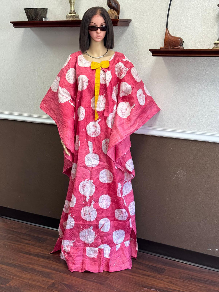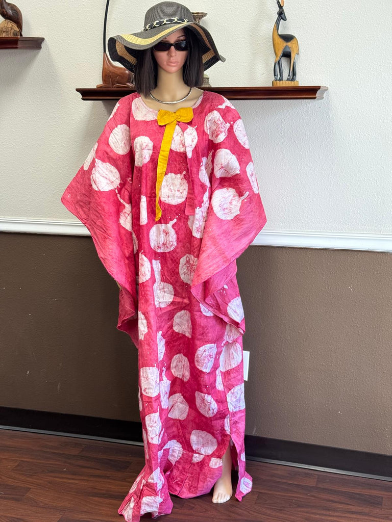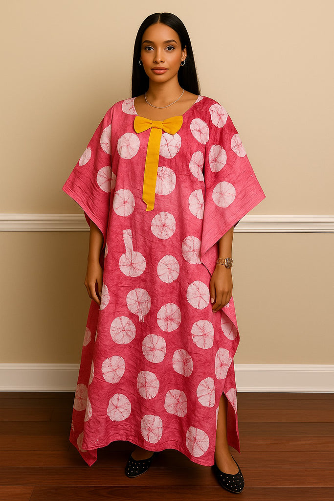 A flowing, ankle-length bubu gown in a vibrant pink tie-dye pattern, featuring bold white circular motifs for a lively, traditional aesthetic. The round neckline is adorned with a striking mustard-yellow bow and long vertical strip, adding a playful yet elegant touch to the design. The gown has wide, draped sleeves and side slits for ease of movement, ensuring both comfort and style. Paired here with simple black flats embellished with gold studs, making it perfect for casual cultural gatherings or relaxed social occasions.