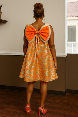 The Golden Bronze Bloom Bow Dress is a radiant statement piece that perfectly balances elegance and playfulness. Crafted from luxurious orange and gold brocade fabric, it features a voluminous A-line...