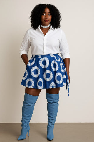 Make a bold, effortless statement in these vibrant blue tie and dye wrap shorts designed for the stylish modern woman. Featuring a unique circular dye pattern on a rich indigo...