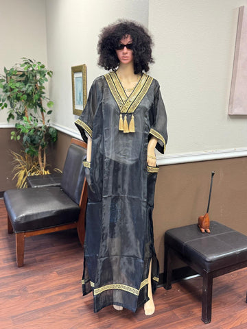 Black Chiffon Kaftan Dress with Gold Embroidery and Tassel Detailing