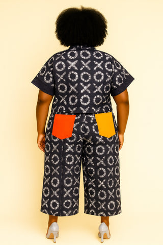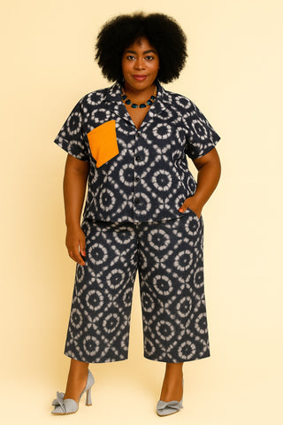 This contemporary two-piece outfit combines bold tie-dye artistry with modern styling. The ensemble features a black and white tie-dye crop top with a collared neckline, offering a clean and minimalist...