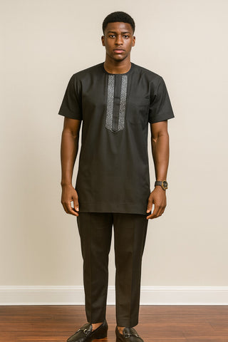 A sleek black short-sleeve senator outfit, styled with two vertical embroidered stripes that run from the chest downward. The look is paired with tailored black trousers, polished leather shoes, and...