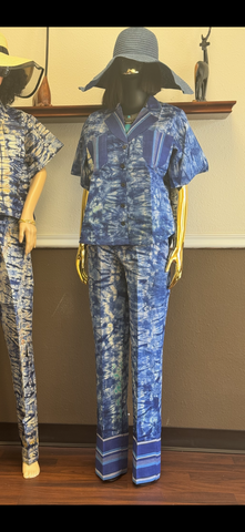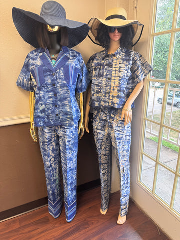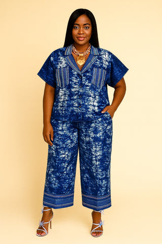 This stylish two-piece set beautifully blends traditional African textile artistry with contemporary fashion. The ensemble features a short-sleeved tie-dye top with a bold indigo and white pattern, highlighted by Aso-Oke...