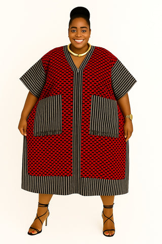 This striking Aso-Oke bubu showcases a bold red and black dotted pattern complemented by contrasting black and gray vertical stripes along the sleeves, neckline, hem, and oversized front pockets. The...
