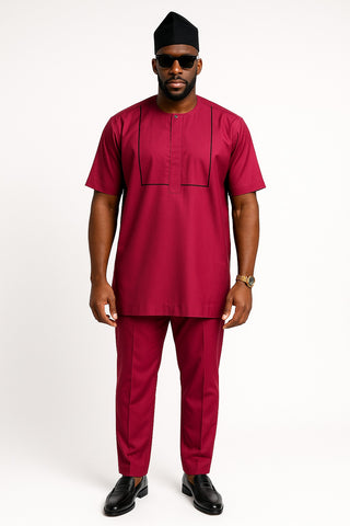 A vibrant wine-colored senator outfit designed with short sleeves and subtle black piping details for added style. Paired with matching trousers, this look offers a confident and elegant appearance, perfect...