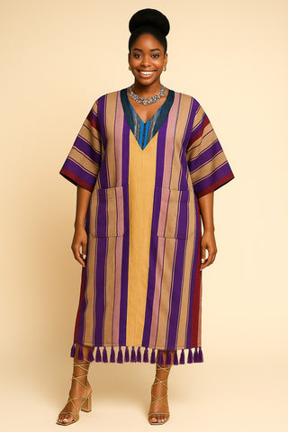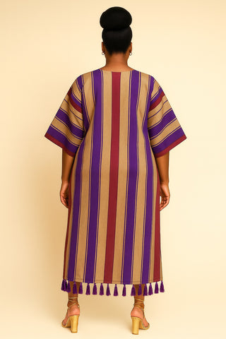 This stunning full-length Aso-Oke bubu is a masterpiece of traditional African craftsmanship, featuring a bold mix of purple, gold, burgundy, and stripe patterns. The design is accentuated by a deep,...
