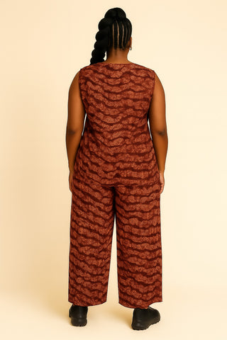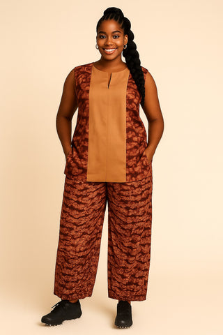 This sleeveless two-piece set brings a rich blend of tradition and modernity to your wardrobe. The top features a bold front panel in plain caramel satin that creates a sharp...