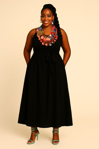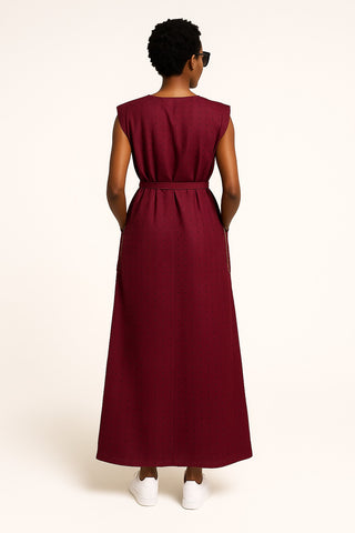 This sophisticated ladies dress is a modern expression of African elegance, blending tradition with comfort. Crafted from rich burgundy eyelet lace, the sleeveless maxi dress features a flattering A-line silhouette...