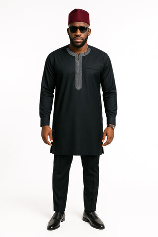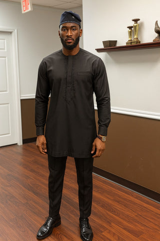 Step into timeless sophistication with this premium Atiku fabric senator set. Crafted from rich black Atiku, the outfit features a long-sleeve tunic with detailed embroidery around the neckline and chest,...