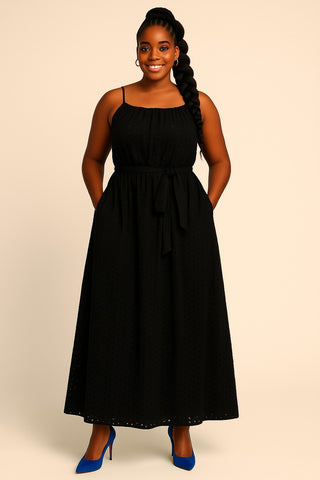 Elegant Black Lace Full-Length Spaghetti Strap Dress with Satin Waist Tie & Side Pockets