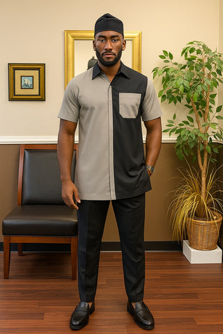 A sharp blend of sophistication and bold design, this dual-tone black and grey senator outfit features a short-sleeve top with contrast pocket detail, paired with sleek black trousers. Completed delivers...