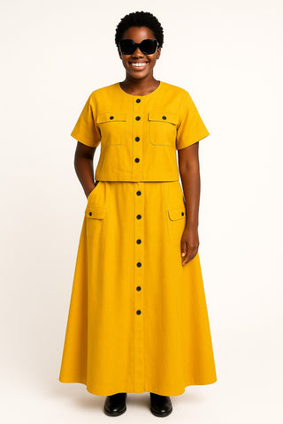 Radiate charm and confidence in this vibrant mustard yellow utility-style dress. Designed with a flattering A-line silhouette, the dress features short sleeves, a round neckline, and bold black front buttons...
