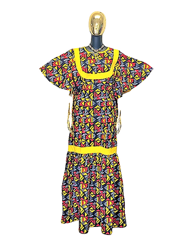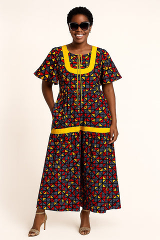 Elevate your style with the Golden Bloom Ankara Maxi Dress—a stunning blend of tradition and elegance. This full-length dress features a bold geometric pattern in red, black, and golden yellow...