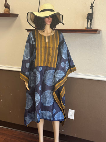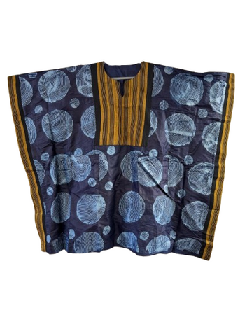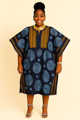 This elegant navy blue tie-dye boubou features bold circular motifs complemented by rich golden Aso-Oke accents along the front panel and side borders. The knee-length design includes short wig-style sleeve...