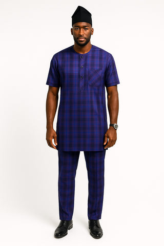 A stylish short-sleeve senator outfit in bold purple and blue checkered fabric, tailored for a modern yet traditional look. Paired with matching trousers, polished black shoes, and a sleek wristwatch,...