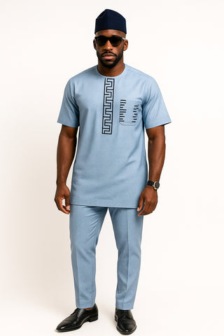 A sleek sky blue senator-style attire crafted with fine detailing, featuring bold black embroidery along the chest placket and pocket for a modern, striking contrast. The set includes a matching...