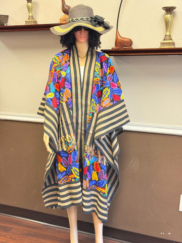 This elegant kimono-style kaftan features bold black-and-grey stripes contrasted with vibrant multicolor embroidered leaf patterns. The relaxed, open-front design drapes gracefully, offering a chic and comfortable fit. Paired with striking...