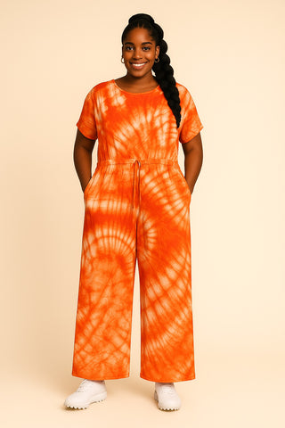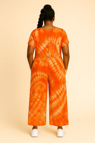 Brighten up your wardrobe with the vibrant charm of this Sunburst Radiance Silk Jumpsuit. Crafted from luxuriously soft silk fabric, this full-length piece features a bold orange and white spiral...