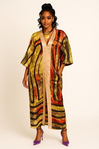 Unveil your bold sophistication with this vibrant full-length kaftan, made from rich yellow, deep red, and black tie-dye chiffon. A soft beige front placket runs vertically from the V-neckline, now...
