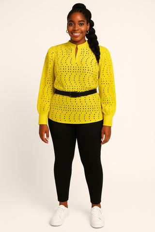 Radiate vibrant elegance with this effortlessly chic outfit, where traditional texture meets modern simplicity. The centerpiece is a striking long-sleeve yellow lace blouse crafted from delicate eyelet fabric. Featuring a...