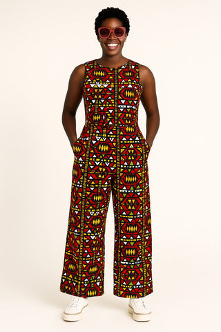 Embrace vibrant heritage with this eye-catching sleeveless Ankara jumpsuit, tailored for confident, modern women. Designed in a bold fusion of geometric African prints in red, yellow, black, and white, this...