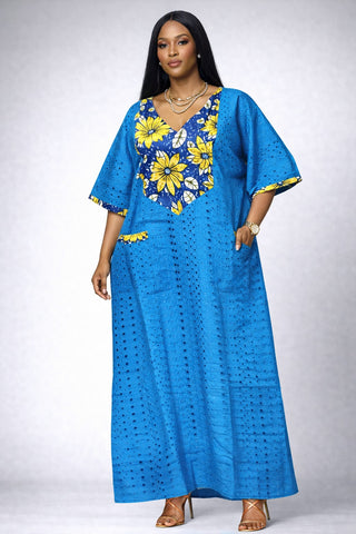 This elegant Ankara Patch Lace Kaftan Bubu Dress is a timeless blend of comfort, culture, and sophistication. Crafted from breathable blue lace fabric, the dress features intricate eyelet detailing that...