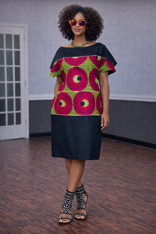 Ankara Panel Knee-Length Dress with Cape Sleeve Detail