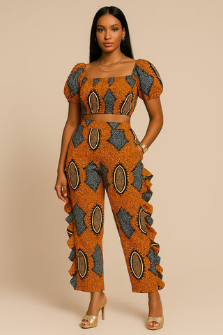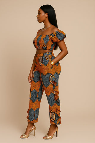 This chic ensemble showcases a vibrant orange and navy Ankara crop top with a square neckline featuring elastic trim and short puffed sleeves with elastic edges, paired with matching Ankara...