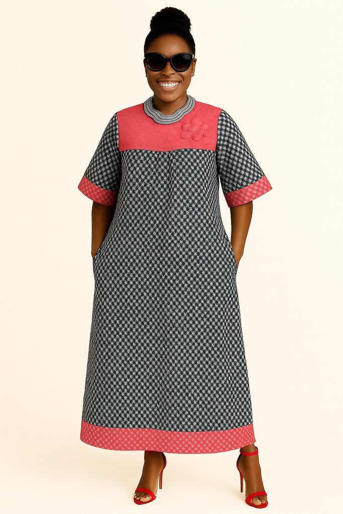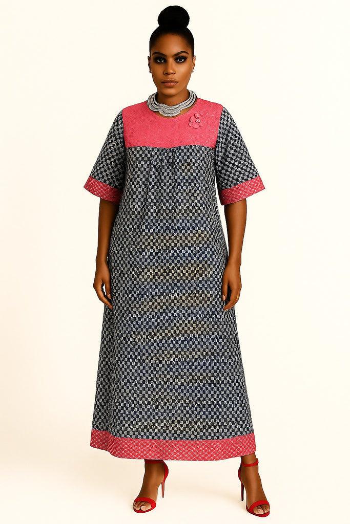 Step into timeless elegance with this exquisite monochrome Bubu gown, designed to deliver comfort with undeniable flair. The floor-length silhouette features a geometric black-and-white patterned fabric, elevated by a rich, textured rose-pink lace yoke and sleeve cuffs. A sculpted floral applique on the upper chest adds a soft, feminine touch, while subtle gathers just below the bust give the gown a graceful flow and ease of movement. The high bun hairstyle, statement silver wavy neckpiece, bold red heels, and a radiant smile complete the poised, modern African woman’s look—perfect for festive gatherings, religious outings, or classy weekend occasions.