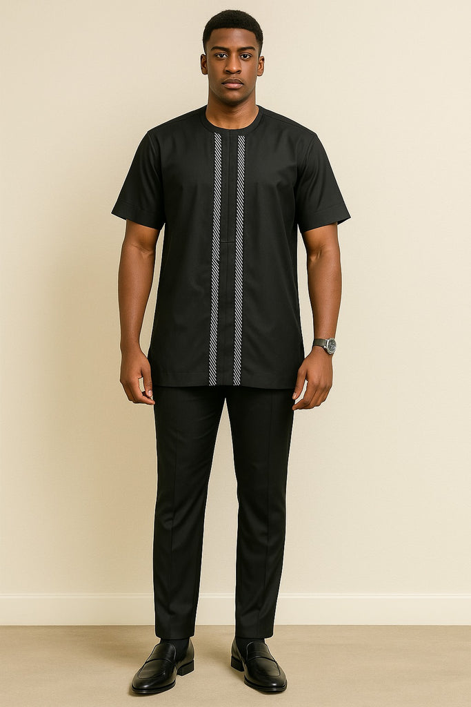 A sleek black short-sleeve senator outfit, styled with two vertical embroidered stripes that run from the chest downward. The look is paired with tailored black trousers, polished leather shoes, and...