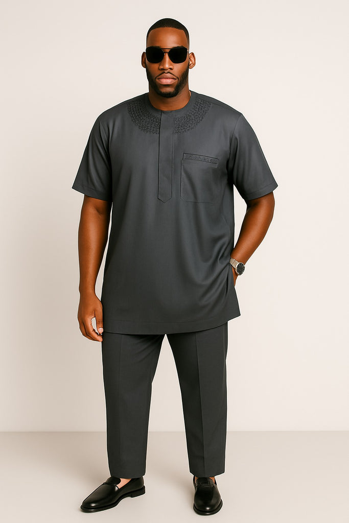 Step out in confidence with this classic metallic grey senator outfit, designed for the modern man who values sophistication and comfort. The ensemble features a short-sleeved top with a round neckline, adorned with intricate embroidered detailing around the chest and neck area. A subtle front chest pocket with decorative trim adds a refined touch, while the clean placket ensures a polished finish.