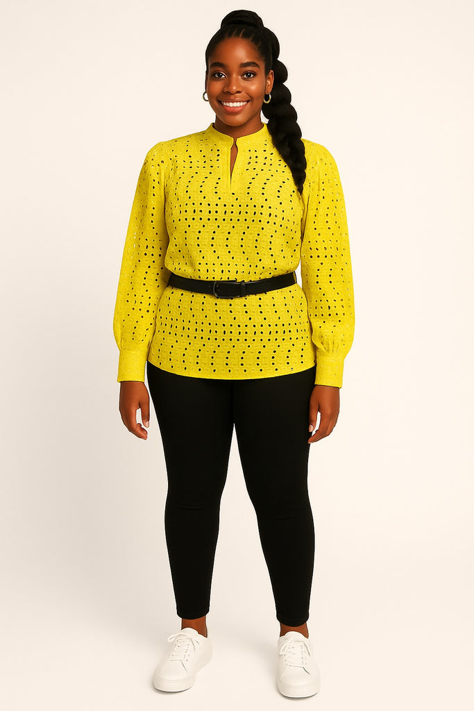 Radiate vibrant elegance with this effortlessly chic outfit, where traditional texture meets modern simplicity. The centerpiece is a striking long-sleeve yellow lace blouse crafted from delicate eyelet fabric. Featuring a bishop neckline with a modest slit opening at the front, the blouse brings a touch of sophistication while maintaining a light, breathable silhouette. The sleeves are finished with crisp cuffs secured by three small buttons at the wrist, adding a refined detail that enhances the structured feel.