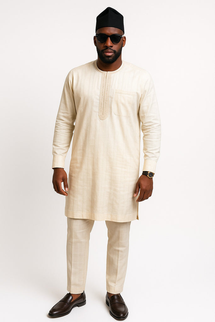 A refined butter-colored Attiku fabric set, tailored in a classic senator style. Paired with a black Yoruba hat, sleek wristwatch, and polished shoes, this look blends cultural pride with modern...