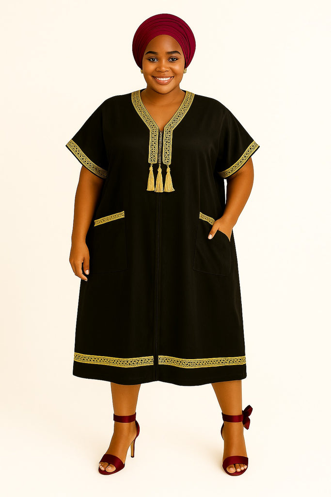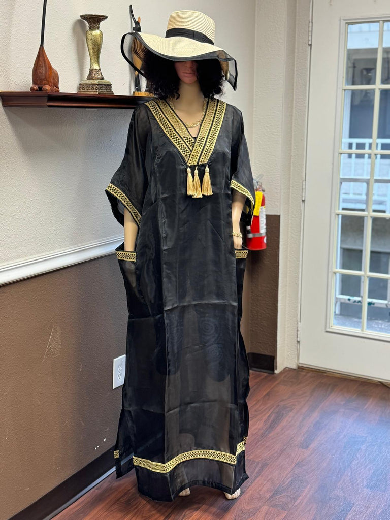 Black Chiffon Kaftan Dress with Gold Embroidery and Tassel Detailing