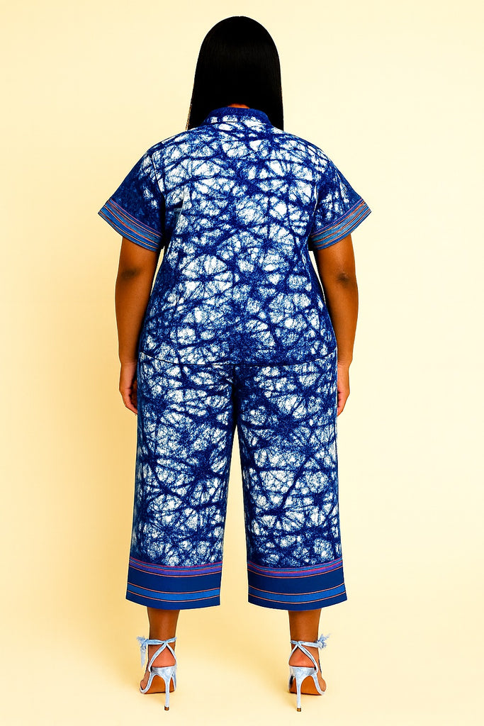 This stylish two-piece set beautifully blends traditional African textile artistry with contemporary fashion. The ensemble features a short-sleeved tie-dye top with a bold indigo and white pattern, highlighted by Aso-Oke fabric accents on the sleeve cuffs and collar, adding a refined cultural touch. The front of the top includes two striped Aso-Oke chest pockets, enhancing both functionality and design.
