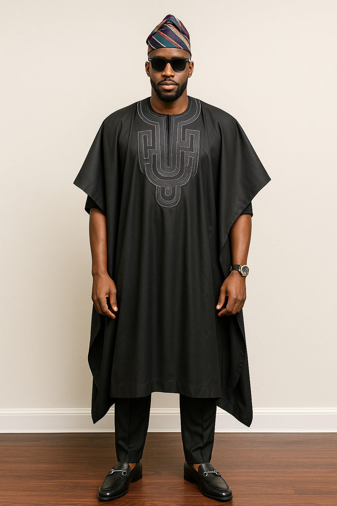 This majestic black agbada, detailed with bold silver embroidery, is paired with a matching inner short-sleeve top and full-length trousers. Styled  vibrantly