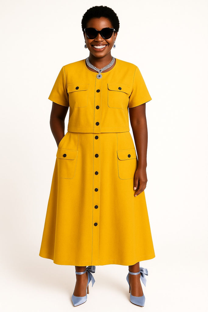 Radiate charm and confidence in this vibrant mustard yellow utility-style dress. Designed with a flattering A-line silhouette, the dress features short sleeves, a round neckline, and bold black front buttons running from top to hem for a sleek, structured look. Four flap patch pockets—two on the chest and two at the hips—add functional flair while enhancing the classic utility aesthetic. The dress is styled with powder blue pointed-toe heels tied at the ankles with bows, and accessorized with a sparkling statement necklace and black cat-eye sunglasses, giving it a polished yet playful finish. Perfect for brunch dates, gallery strolls, or standout daytime events.