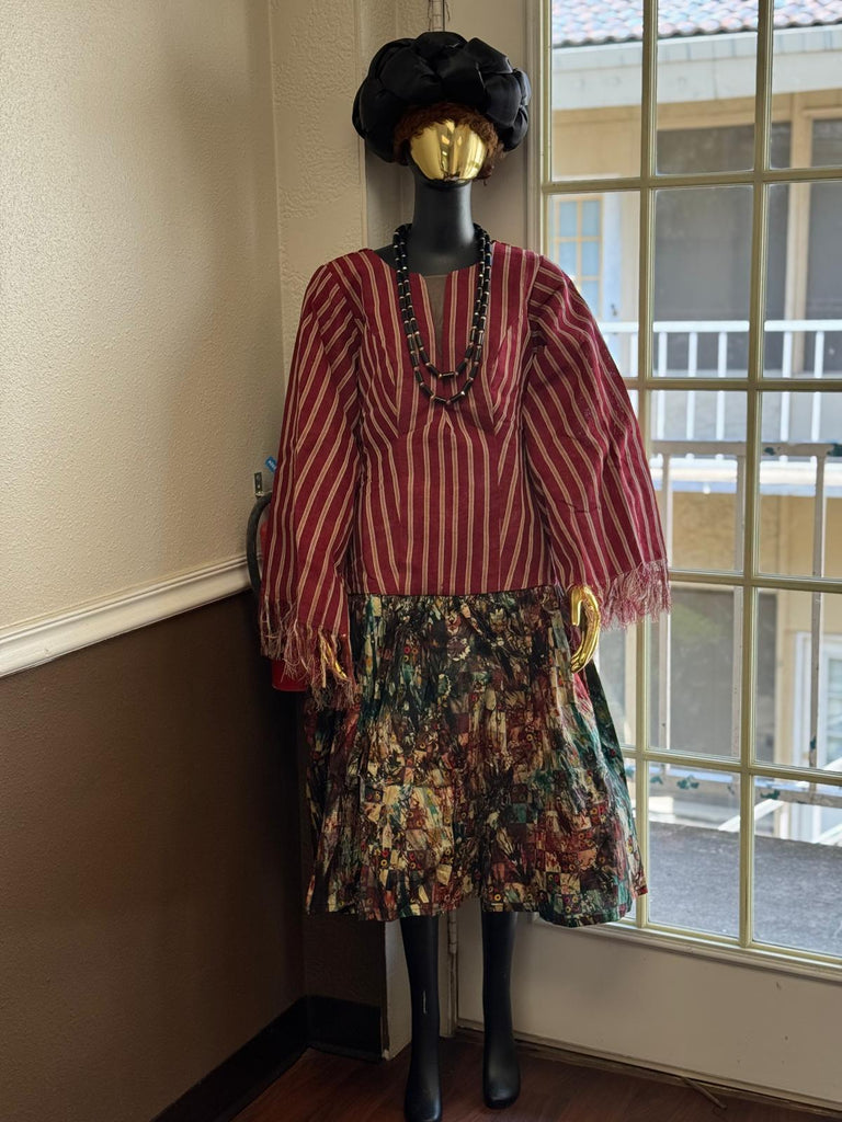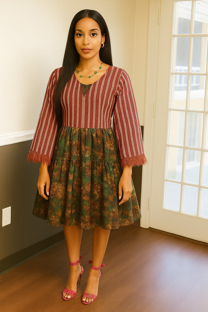 This chic ensemble features a free-flowing Aso-Oke upper bodice with long wrist-length sleeves adorned with fringed hems for added texture. A subtle V-neckline is detailed with a delicate tiny net insert, blending sophistication with tradition. The flared tie-dye lower skirt adds vibrant contrast, creating a graceful silhouette perfect for cultural events and stylish outings. Paired with strappy heels and a minimalist necklace, this look exudes timeless African elegance with a modern twist.