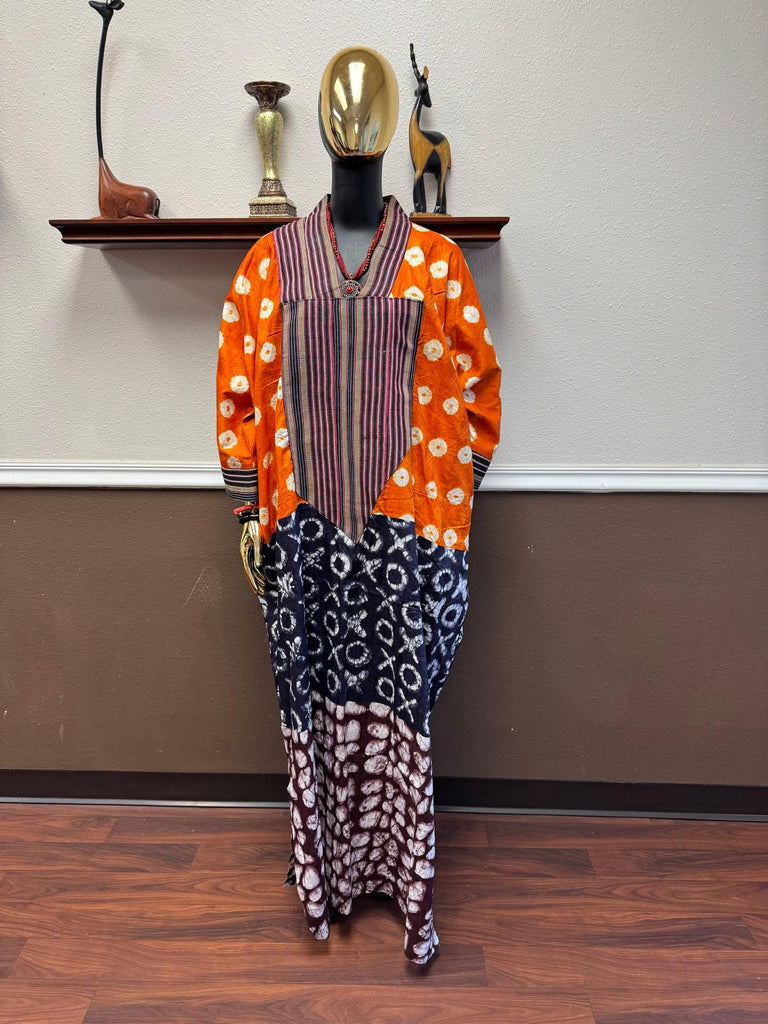 This elegant bubu gown showcases a stunning fusion of vibrant Aso-Oke fabric and tie-dye patterns, designed in a full-length silhouette that gracefully reaches the floor. The wide bat sleeves create a flowing, regal look, adding volume and comfort to the outfit. The multi-pattern design combines rich orange hues with earthy tie-dye tones, offering a bold and stylish aesthetic. Perfect for cultural events or formal gatherings, this gown exudes traditional charm with a modern flair