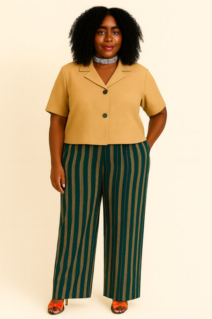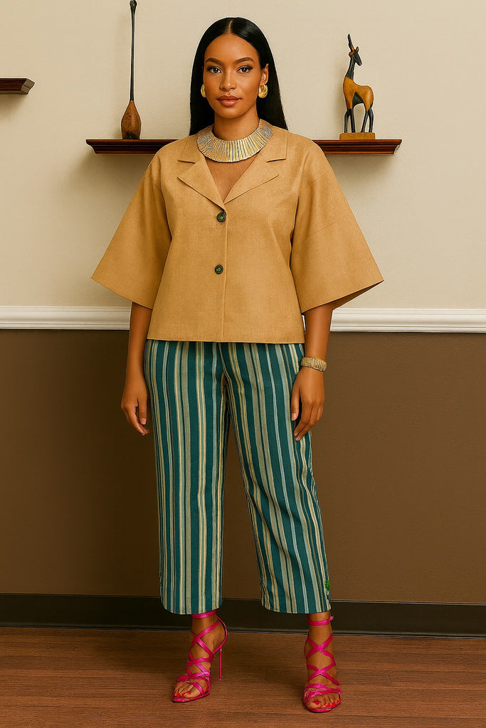 Paired with it are full-length wide-leg pants crafted from Aso-Oke fabric in deep green with vertical mustard-gold stripes, creating a lengthening and elegant effect. The pants are tailored to drape beautifully over the shoes, offering a flattering and elongated silhouette.