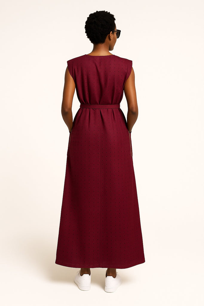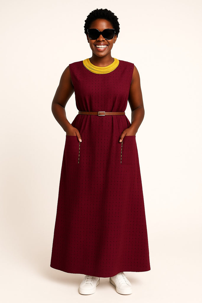 This sophisticated ladies dress is a modern expression of African elegance, blending tradition with comfort. Crafted from rich burgundy eyelet lace, the sleeveless maxi dress features a flattering A-line silhouette cinched with a slim waist belt. While the main fabric adds a graceful flow, the subtle touch of Ankara tape detail at the side of the pockets brings a tasteful nod to African heritage—perfectly balancing minimalism and culture.