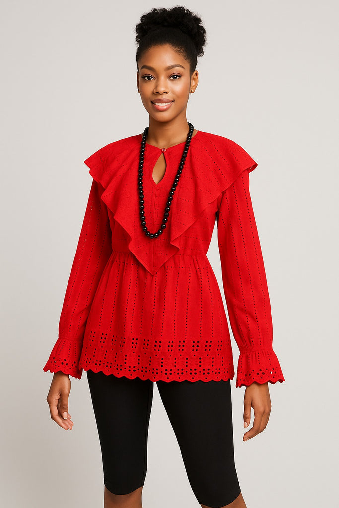 The Crimson Flap Free-Fit Eyelet Top is a bold yet effortless statement piece designed for comfort and elegance. Crafted in rich red eyelet fabric, this top features a distinct open flap neckline that is intentionally not joined, giving it a relaxed, airy silhouette.