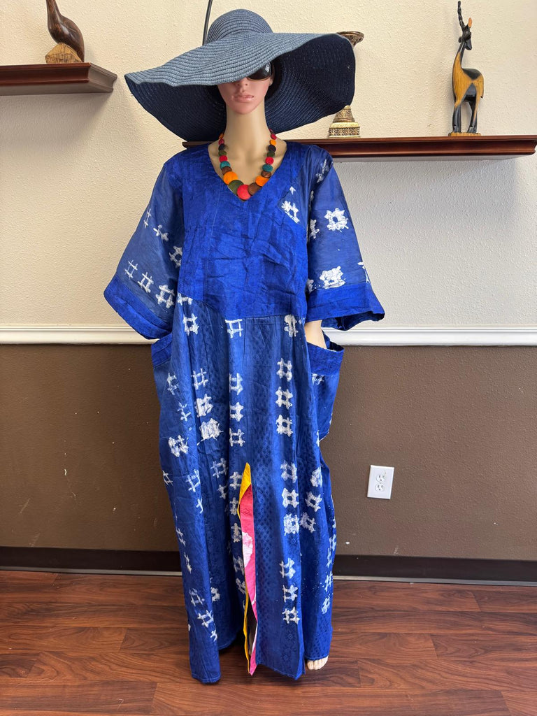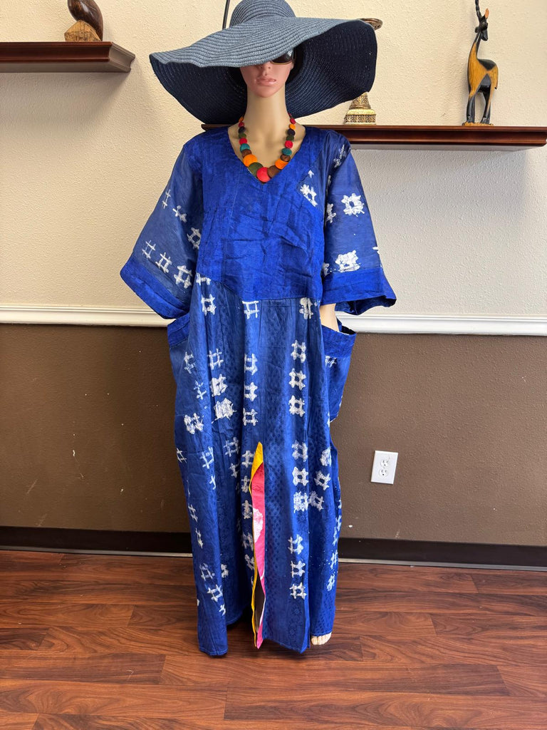This regal ankle-length kaftan showcases a rich royal blue base, beautifully decorated with white geometric tie-dye motifs for a classic yet modern appeal. Designed with a relaxed V-neckline, wide short sleeves, and side pockets, it blends style with everyday comfort. The front slit reveals a vibrant multicolor accent panel in shades of pink and yellow, adding a playful pop of color and visual contrast. Perfect for cultural occasions, casual elegance, or vacation wear, this piece celebrates the artistry of mixed tie-dye patterns with a contemporary twist.