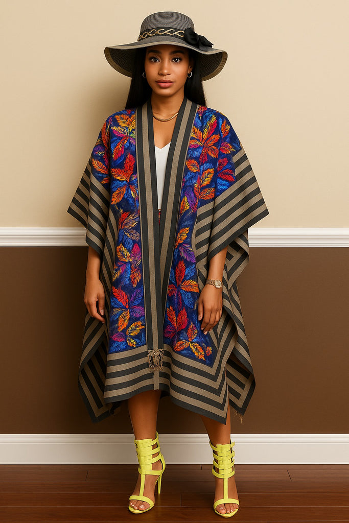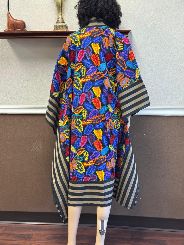 This elegant kimono-style kaftan features bold black-and-grey stripes contrasted with vibrant multicolor embroidered leaf patterns. The relaxed, open-front design drapes gracefully, offering a chic and comfortable fit. Paired with striking...